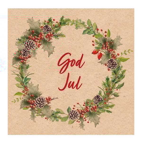 Skapa en varm och inbjudande julstämning med servetterna God Jul Julkrans från Ambiente. Det vackra motivet med granris, kottar och röda bär ramas in av texten God Jul i mitten – perfekt till julbordet.