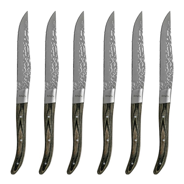Amefa Royal Steak biffknivar Lunar är ett pålitligt set om sex knivar som förenar effektiv funktion med tilltalande design. Med tandade blad och kraftiga träskaft i hamrad finish är de ett utmärkt val till alla kötträtter – från grillat till stek.