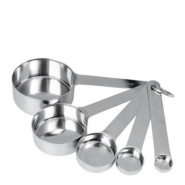 Steel Essential måttsats från Anders Petter kombinerar funktion och hållbarhet i en design som passar in i alla typer av kök. De fem köksmåtten ger exakta mått i både deciliter och milliliter – perfekta för allt från kryddor och bakingredienser till vätskor.