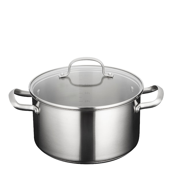 Stenfors Gryta med lock 5 L i matt rostfritt stål från Anders Petter är en stilren och praktisk kastrull, perfekt för dagligt bruk. Den är utrustad med en tydlig måttskala på insidan för att underlätta exakta mätningar, samt ett värmetåligt glaslock som gör att du enkelt kan hålla koll på matlagningen. Den stålomslutna botten med aluminiumkärna säkerställer snabb och jämn värmespridning. Kastrullen är kompatibel med alla typer av spishällar, inklusive induktion.