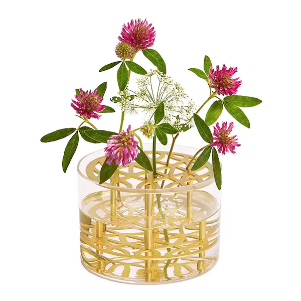 Klong Äng Vas har gett oss möjligheten att arrangera blommorna på ett nytt, vackert sätt. Vasen är tillverkad i mässing eller rostfritt stål med tillhörande glasinsats. Glasvasen är munblåst i Tjeckien. Den utskurna metallställningen fungerar som ett inbyggt blomsterstöd.