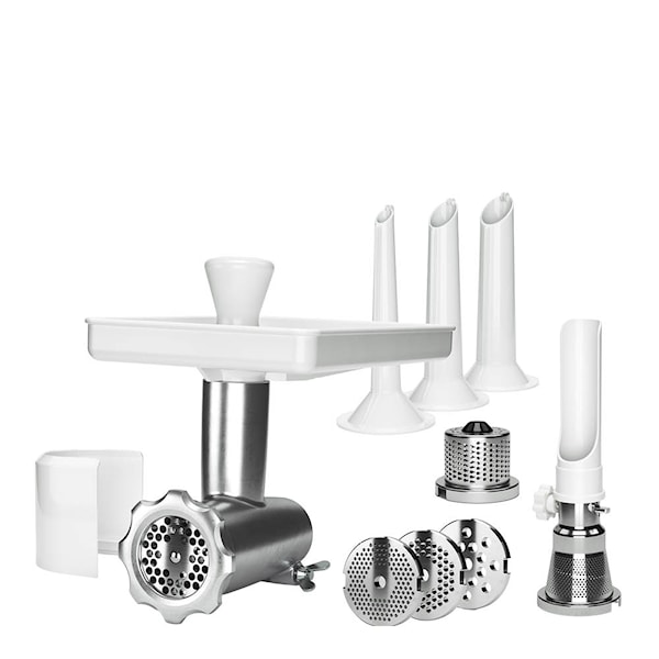 Köttkvarnen levereras med fyra hålskivor i storlekarna 2,5 mm, 4,5 mm, 6 mm och 8 mm och tre korvhorn i storlekarna 10 mm, 20 mm och 25 mm. Med dessa tillbehör öppnas möjligheter för att mala färs med olika malningsgrad och du kan göra både klassiska korvar, kryddstarka korvar och vegetariska alternativ som falafel eller kikärtsfärs.