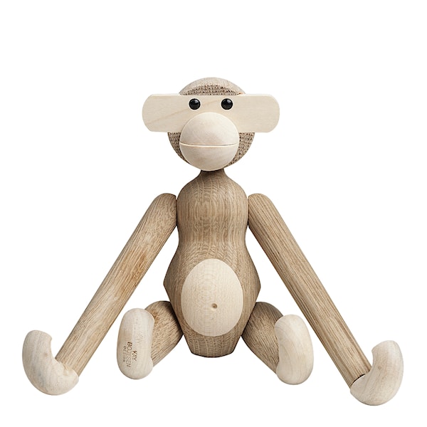 Kay Bojesens apa är tillverkad i Danmark och varje apa är helt unik i sina färgskiftningar – men självklart alltid av den goda kvalitet som utmärker Kay Bojesen. Apan i liten storlek på 20 cm finns i tre varianter av olika färger och träslag: teak/limba, rökt ek och ek/lönn.