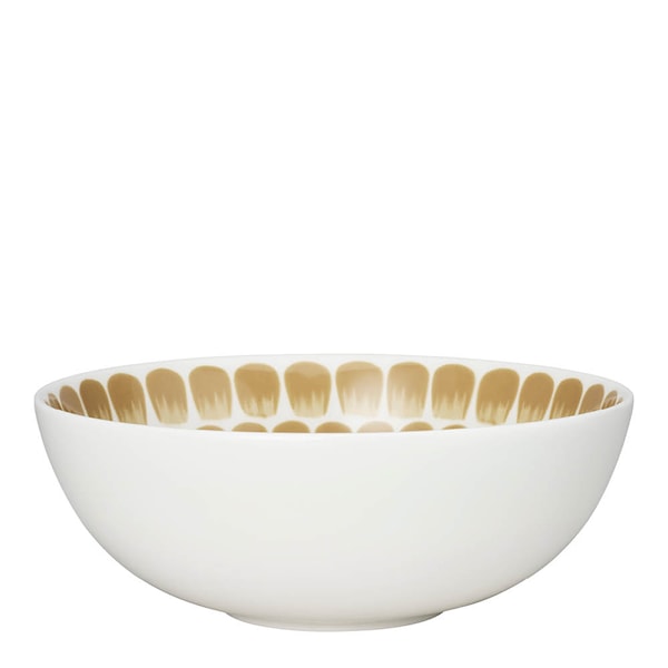 Den beigea Tuokio-skålen är en mångsidig skål som är lämplig för både söta och salta rätter. Den djupa skålen på 18 cm rymmer 0,8 l. Det starka mönstret är en vacker del av dukningen. Servisens handmålade intryck i kombination med det moderna mönstret passar dagens mångformiga dukningar. Därtill passar delarna utmärkt ihop med serviser som 24h, Paratiisi eller Koko.