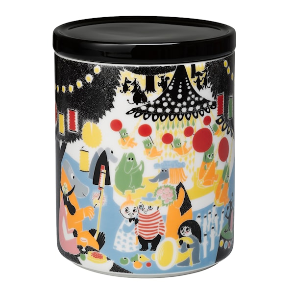 Fin burk från Arabia med muminmotivet "Vänskap". Arabias konstnär Tove Slotte har hämtat motivet från Tove Janssons bok "Vem ska trösta knyttet?" från 1960. Mycket händer i illustrationen, en glad hemul umgås med sina gäster, det är fyrverkeri, dans, spel och sång. En mycket användbar burk som blir en fin prydnad i ditt hem med sina härliga färger.