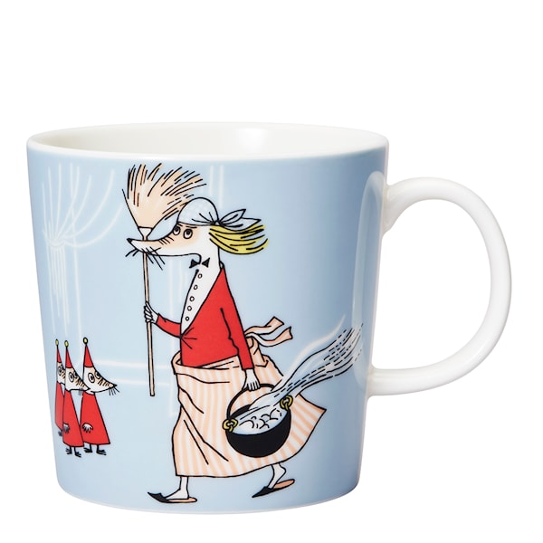 Muminmugg Filifjonkan från Arabia visar den pedantiska och lite neurotiska Filifjonkan – en karaktär som älskar ordning, städning och kontroll. På den grå muggen ur Muminklassiker-serien ser vi henne i full gång med sin största passion: storstädningen. Med såpa, vatten och en envis blick tar hon sig an varje dammråtta som vågat gömma sig i hennes hus.