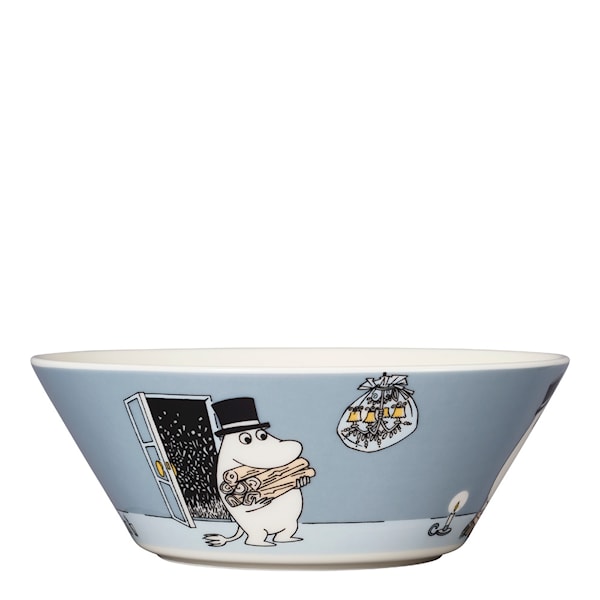 Mumin Skål Muminpappa från Arabia är den allra senaste ur Muminkollektionen med Muminpappan pappan mot en vackert grå bakgrund.