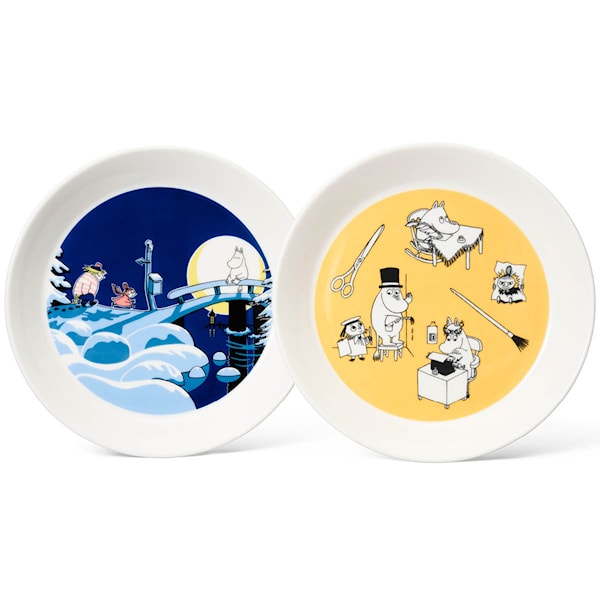 Mumin Tallrikset Kontor & Vinternatt från Arabia passar perfekt till stora som små, fest som till vardags. I setet ingår två tallrikar, där den ena visar Mumintrollen på kontoret och den andra visar en vinternatt i ett snölandskap.