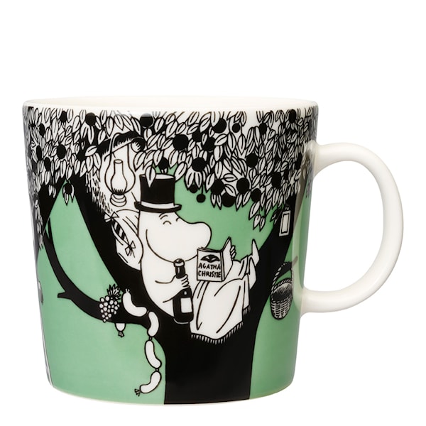 Muminmugg 40 cl från Moomin by Arabia i en härligt lummig grön färg. Muminpappan har flyttat upp i ett träd långt bort från alla skyldigheter och måsten, kanske sitter han där uppe och dagdrömmer om alla äventyr han gjorde i ungdomens dagar. Oavsett ser han väldigt förnöjd ut i sin nya boning – fri som en fågel och ett med naturen.