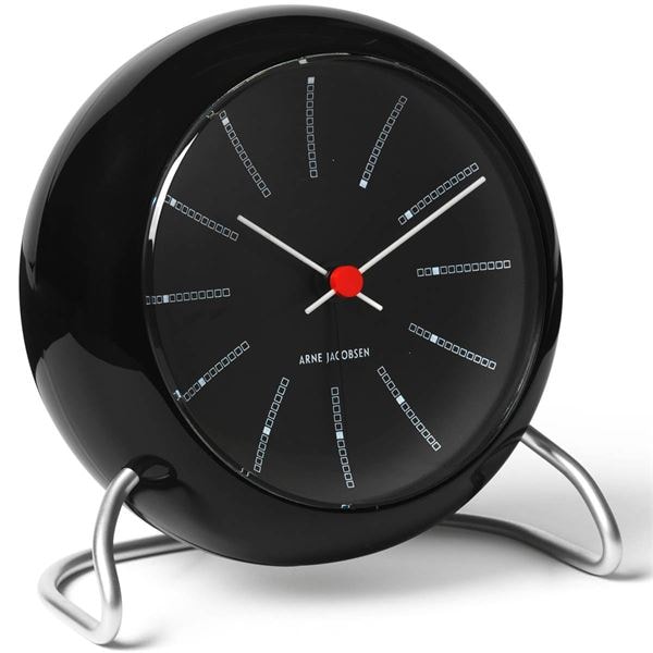 Bordsuret Bankers från Arne Jacobsen är en diskret men karaktärsfull detalj som förmedlar ett starkt formspråk genom sitt enkla och genomarbetade uttryck. Med en diameter på 11 cm är det kompakt och passar naturligt in i olika miljöer, från skrivbord till nattduksbord eller hylla. Uret är tillverkat i härdat, slagfast glas och har ett svart mot svart färgschema som förstärker dess distinkta och moderna utseende. Foten i massivt rostfritt stål tillför både stabilitet och en elegant kontrast till urverkets grafiska form.