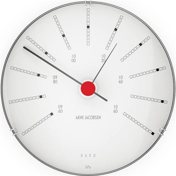 Bankers Barometer 12 cm i vitt är en del av Arne Jacobsens eleganta väderstationsserie, där form och funktion möts i en stilren helhet. Med inspiration från vägguret han designade för Nationalbanken i Köpenhamn 1971, speglar barometern det karakteristiska grafiska uttrycket som gjort Jacobsen till en av modernismens främsta gestalter.