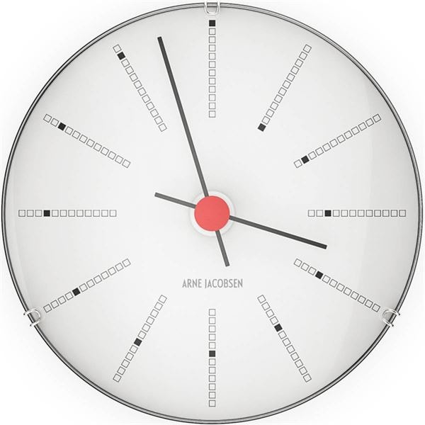 Bankers Väggur 12 cm i vitt är en stilren och funktionell del av Arne Jacobsens väderstationsserie, inspirerad av det ikoniska uret han designade för Nationalbanken i Köpenhamn 1971. Klockan kännetecknas av ett tydligt grafiskt formspråk och en minimalistisk elegans som gör den till ett tidlöst inslag i hemmet.