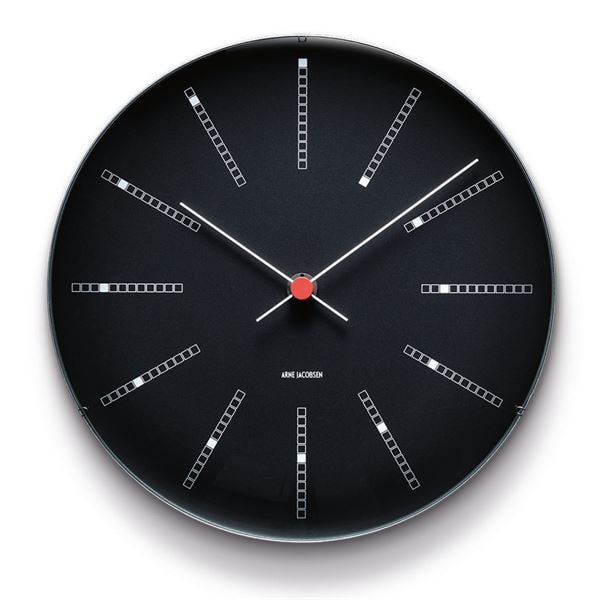 Arne Jacobsens Bankers väggur i svart är en stilren designklocka med en diameter på 29 cm. Klockan, som ursprungligen skapades 1971 för Nationalbanken, har nu blivit en tidlös klassiker för hemmet. Dess unika och genomarbetade detaljer ger en modern känsla som fångar blickar och ger karaktär åt ditt rum. En extra detalj som fascinerar är den snillrika spiralen som smidigt visar tiden, timme för timme, dag och natt. Finns även i en mindre storlek med en diameter på Ø21 cm.