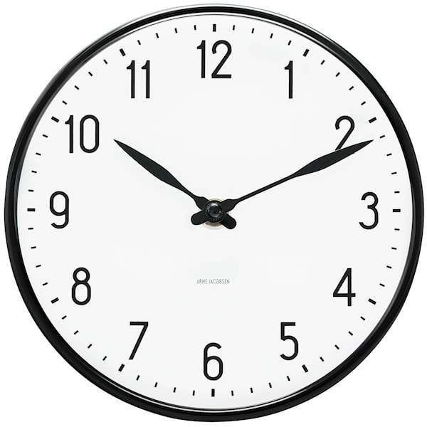 Arne Jacobsen Station väggklocka 16 cm är en klassiker inom dansk design och en elegant detalj i varje hem. Ursprungligen formgiven 1941 för LK, är detta ett ur som kombinerar tydlig grafik med stilren estetik. Den svarta ramen i aluminium ramar in den vita urtavlan med Arne Jacobsens karaktäristiska typografi.