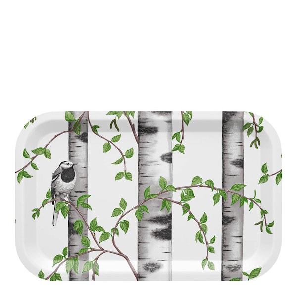 Björkskogsmönster ger brickan ett dekorativt uttryck vid servering