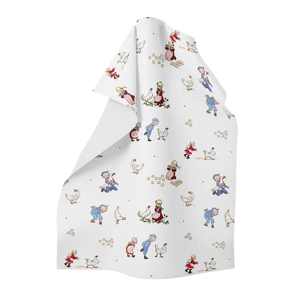 Arvidssons Emil & Ida i hönsgården kökshandduk 47x47 cm offwhite är en funktionell handduk med dekorativt motiv från Astrid Lindgrens berättelser. Designen av Björn Berg visar Emil och Ida i en livfull scen med hönor, tupp och ägg, vilket ger ett klassiskt och detaljrikt uttryck.