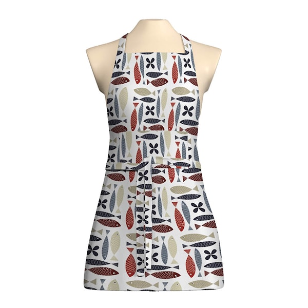 Fina fisken förkläde blå från Arvidssons Textil är ett uttrycksfullt och grafiskt textilmönster signerat Linda Svensson Edevint. Med sin retroinspirerade design och tydliga referenser till 1950–60-talet, tillför det ett lekfullt och stilrent uttryck till hemmet.