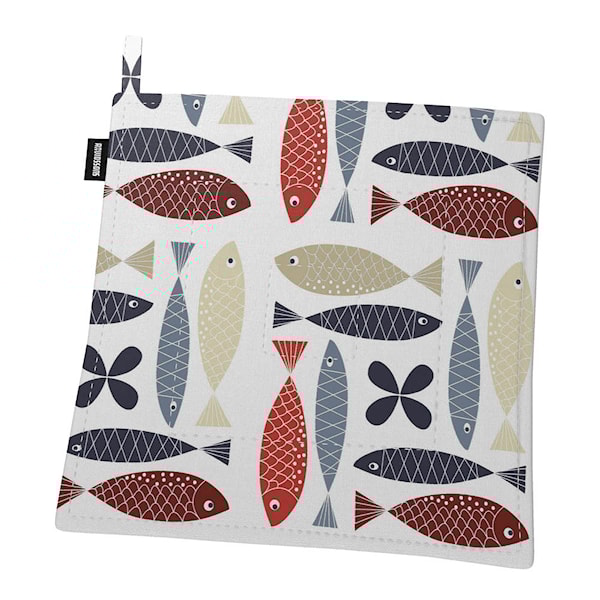 Fina fisken grytlapp blå från Arvidssons Textil kombinerar funktion med retroinspirerad design. Med Linda Svensson Edevints grafiska fiskmotiv skapas ett tydligt uttryck som påminner om 50–60-talets skandinaviska formspråk.