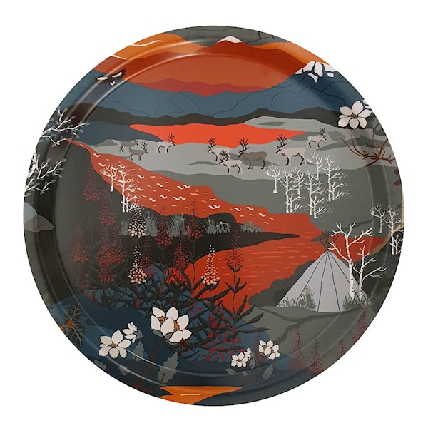 Fjällvandring serveringsbricka Ø31 cm från Arvidssons Textil är dekorerad med ett konstnärligt motiv av Louise Videlyck – inspirerat av Nordens vilda natur med renar, fjäll och porlande bäckar.