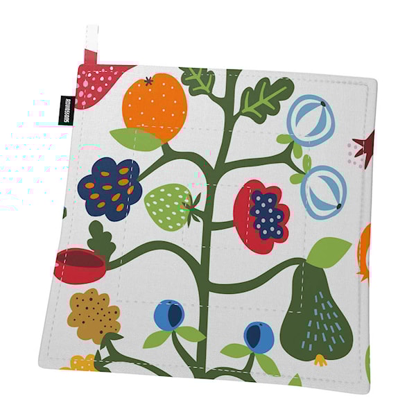 Fruktträd grytlapp multi från Arvidssons Textil är en livfull och dekorativ kökstextil designad av Edholm Ullenius. Mönstret har trädgårdsinspirerade former med en touch av retro, kombinerat med modern skandinavisk designkänsla.