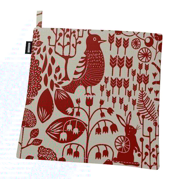Fyri grytlapp röd från Arvidssons Textil är ett dekorativt och funktionellt kökstextil designat av Linda Svensson Edevint. Det upprepade mönstret i rött och beige hämtar inspiration från äldre nordisk väv- och broderitradition.
