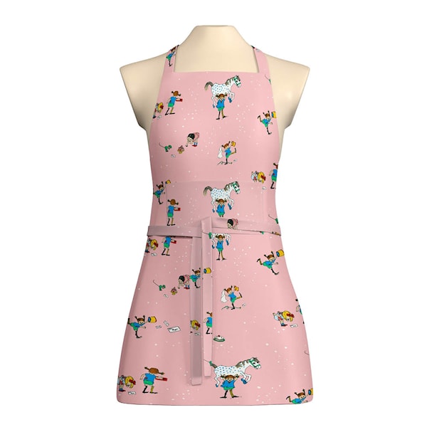 Pippi med vänner förkläde rosa från Arvidssons Textil är ett charmigt inslag i köket. Motivet med Pippi Långstrump och vännerna, illustrerat av Ingrid Vang Nyman, ger både färg och personlighet.