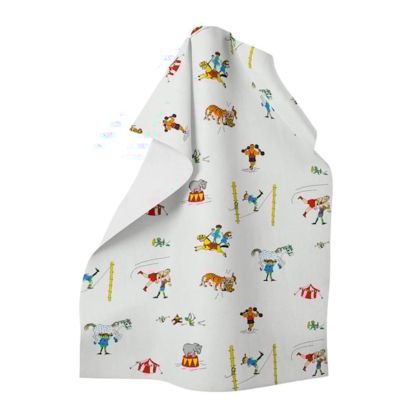 Kökshandduken Pippi på cirkus vit från Arvidssons Textil är dekorerad med charmiga illustrationer av Pippi Långstrump i cirkusmiljö, ritade av Ingrid Vang Nyman.