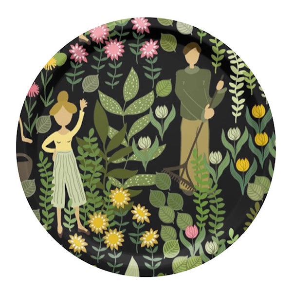 Trädgård rund bricka Ø31 cm från Arvidssons Textil är tillverkad i Sverige och designad av Louise Videlyck. Det skandinaviska mönstret i svart och grönt ger ett lugnt och stilrent intryck.