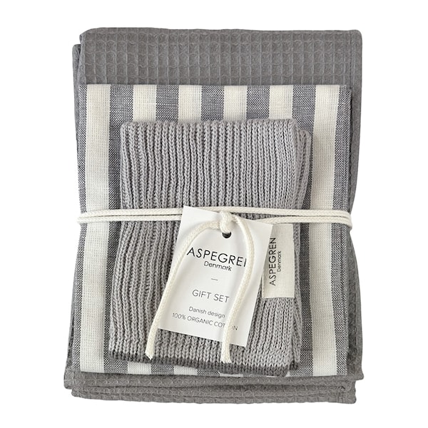 Ge ditt kök en touch av nordisk elegans med vårt hållbara presentset Flint Gray från Aspegren, innehållande två kökshanddukar och en disktrasa. Detta set är perfekt för olika tillfällen och är inte bara långvarigt utan också omsorgsfullt designat för hållbarhet. Varje design är skapad med enkelhet och nordisk elegans i åtanke.