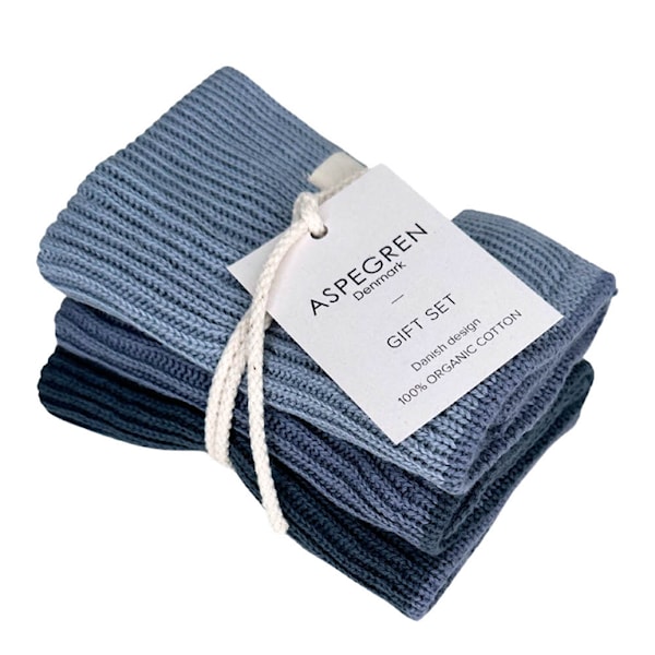 Disktrasorna levereras i tre olika blå nyanser – en genomtänkt palett som passar både ljusa och mörka köksmiljöer. En perfekt present till den som uppskattar vackra detaljer i vardagen, eller ett sätt att ge ditt eget kök en subtil färgklick. Alla trasor tål 60 °C maskintvätt.