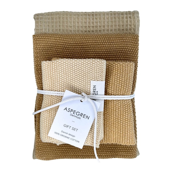 Detta vackra gåvoset från Aspegren Denmark bjuder på en varm färgpalett i nyanser av senapsgult, khaki och halmgult. Setet innehåller två kökshanddukar i olika storlekar och två disktrasor av modellen Solid, samtliga tillverkade i 100% bomull. Med inspiration från nordisk enkelhet ger dessa textilier både funktion och stil till köket.