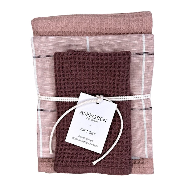 Ge köket en mjuk färgaccent med detta eleganta gåvoset från Aspegren Denmark. Setet innehåller två kökshanddukar i rosa och en matchande disktrasa i mörkare hallonrosa nyans – alla tillverkade i 100% bomull. Designen är formgiven av Charlotte Aspegren och hämtar inspiration från enkel nordisk elegans.