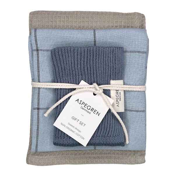 För dig som uppskattar dämpade färger och naturliga textilier är gåvosetet Blue Cheese från Aspegren ett klockrent val. Setet innehåller en disktrasa i modellen Ripple, samt två kökshanddukar: en i en linne- och bomullsblandning med rutigt mönster (Squares), och en enfärgad i 100% bomull (North).