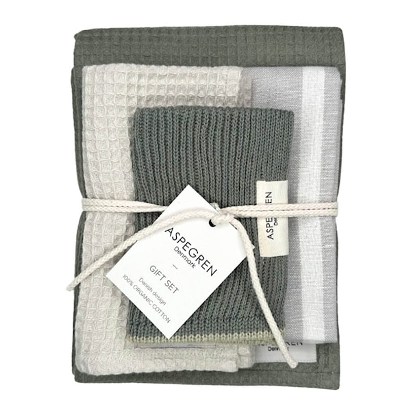 Ge köket ett harmoniskt lyft med detta 4-delars gåvoset från Aspegren Denmark. Setet består av två kökshanddukar och två disktrasor i vackert samstämda nyanser som olive, silver gray, sea gras och light beige. Kombinationen av olika textilstrukturer – linneblandning, bomull och räfflad yta – gör detta set både funktionellt och stilfullt.