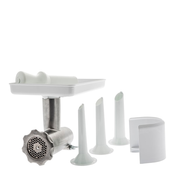 Kvarnen innehåller kvarnhus med kvarnvals, 4-bladig kniv, 4.5 mm hålskiva, matarbord, matarpropp, stänkskydd och 3 korvhorn 10/20/25 mm.