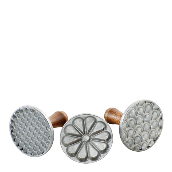 Setet innehåller tre stycken kakstämplar med trähandtag.