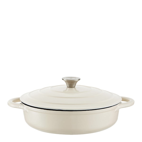 Gjutjärnsgryta låg 28 cm 2,5 L från Barbary & Oak är tillverkad med högkvalitativt gjutjärn som effektivt bibehåller värmen, vilket gör den idealisk för att skapa läckra grytor för hela familjen. Den emaljerade ytan förhindrar maten från att fastna och gör rengöringen enkel, samtidigt som den inte absorberar lukt eller smak. Grytan kan användas på alla värmekällor, inklusive induktion.