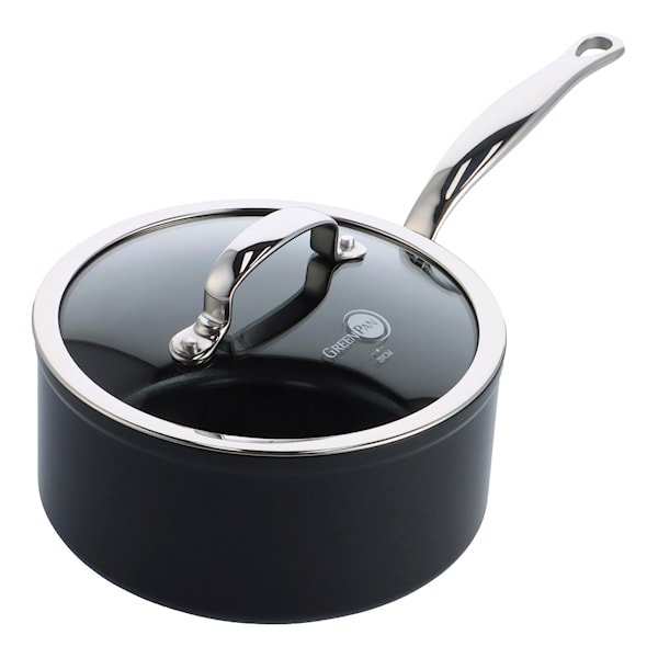 Kastrull i aluminium med en diameter på 18 cm och medföljande glaslock från belgiska GreenPans Barcelona Pro-serie.