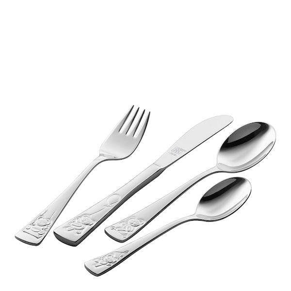 Lekfullt bestickset med roliga motiv av olika teddybjörnar som sprider gott humör vid matbordet. Kommer i en fin presentask och är en perfekt födelsedags- eller doppresent. Setet innehåller 1 barngaffel, 1 barnsked, 1 barnkniv och 1 barntesked.