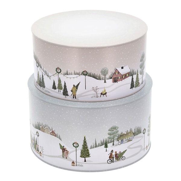 Kakburksset Vinter 22x12/20x10 cm Arctic Ice/Woodrose Metall. Set med två kakburkar av metall med äventyrliga vintermotiv. Serien Vinter är skapad i samarbete med designern Dorthe Mathiesen. Hennes motiv med de karaktäristiska grafiska strecken och ljusa, nordiska pastellfärgerna speglar atmosfären under de mysiga vintermånaderna och skildrar landsbygdens snölekar, stämningsfulla vinterlandskap och umgänge med familj och vänner, som betraktaren kan hoppa in i själv och bygga vidare på.
