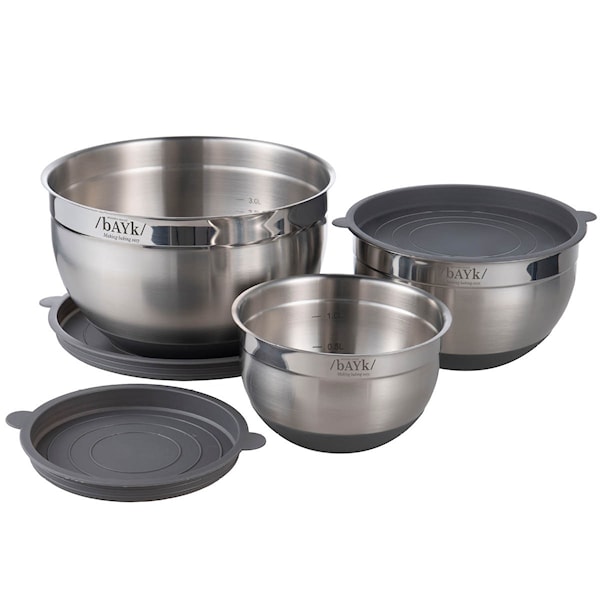 Det praktiska bAYk skålsetet från Modern House, tillverkat i rostfritt stål, är utformat för att göra din matlagning både enklare och mer effektiv. Setet består av tre skålar i storlekarna 5,4 liter, 3 liter och 1,6 liter, alla utrustade med en stabil silikonbotten som säkerställer att skålarna står stadigt på bänkskivan under matförberedelserna. Detta gör dem perfekta för både bakning och matlagning.
