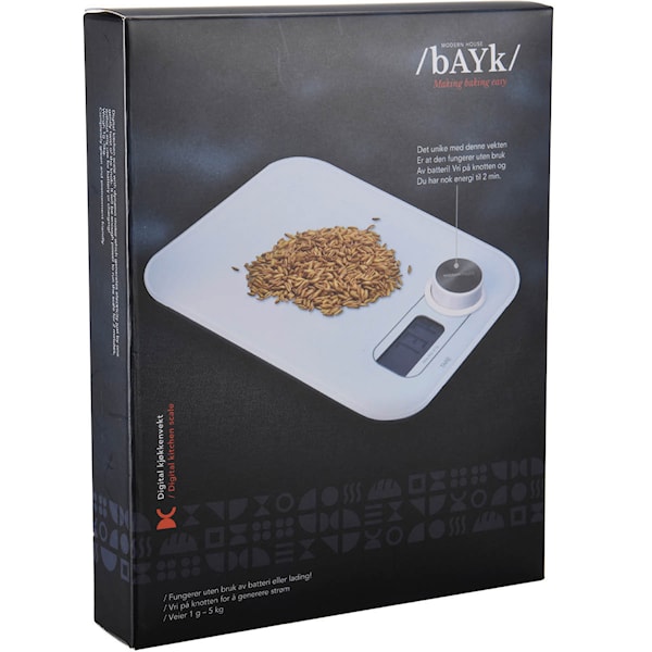 Med denna innovativa digitala köksvåg behöver du varken batterier eller laddare. Den inbyggda dynamon genererar ström när du vrider på ratten, vilket ger upp till två minuters användning – helt utan extern strömkälla. Vågen väger från 1 gram till 5 kilo med hög precision och är ett smart val för det moderna köket. Rengörs enkelt för hand.