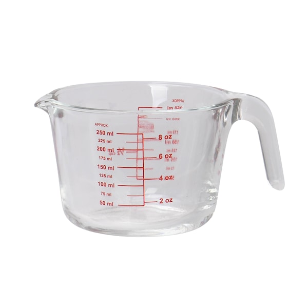 Denna klassiska måttbägare i tjockt, robust glas rymmer 250 ml och är ett oumbärligt redskap för exakt mätning i köket. Perfekt för både torra och flytande ingredienser – oavsett om du bakar, lagar mat eller blandar dressingar. Den transparenta designen gör det enkelt att läsa av mängden med precision.