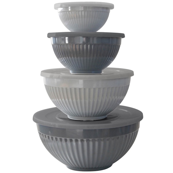 Skålsetet från bAYk-serien är ett funktionellt 4-pack från Modern House som förenar smart design med daglig användbarhet. Med fyra olika storlekar och tillhörande lock blir det enkelt att förvara, servera eller förbereda olika rätter. Tack vare att skålarna kan staplas i varandra (utan lock) frigör du värdefull plats i köket.