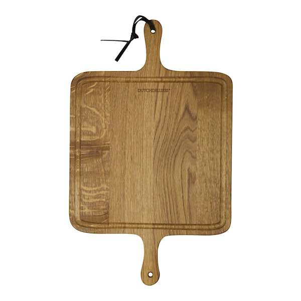 Riktigt stor skärbräda med dubbla handtag från Dutchdeluxes, tillverkad av solid ek. Den här stora skärbrädan har en slät sida som är perfekt som uppläggningsfat för större sällskap. Den andra sidan har utskurna skåror för som samlar upp vätska så som kött- eller fruktsaft. När skärbrädan inte används blir den en snygg inredningsdetalj om du hänger upp den.