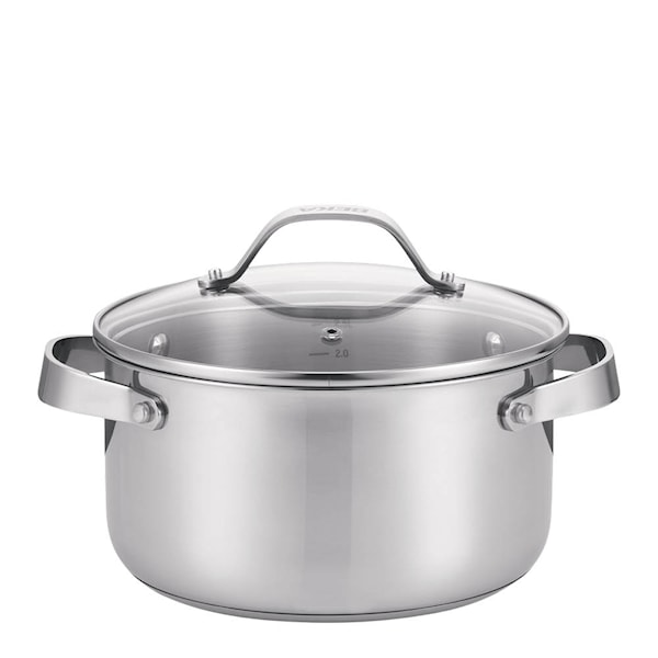 Grytan har 3-lagersbotten för jämn värme över hela ytan. De nitade handtagen ger säkert grepp och glaslocket med ånghål gör det enkelt att följa tillagningen. Med invändiga måttskala kan du dosera direkt i grytan utan extra mått.