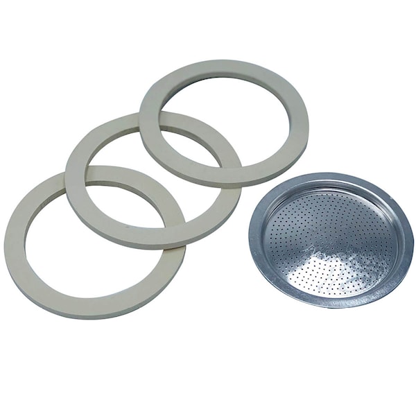 Setet innehåller 3st packningar och 1st filterplatta. Passar till Moka Express för 1 kopp.