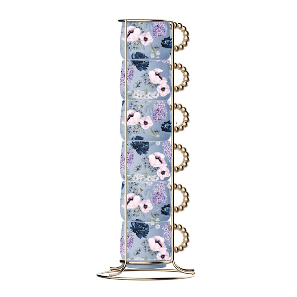De sex porslinskopparna rymmer 6 cl vardera – perfekt för espresso eller andra små serveringar – och kan smidigt staplas i det medföljande metallstället som både sparar plats och blir en dekorativ detalj i köket eller på serveringsbrickan. Muggarna bör handdiskas för att bevara sin glans och levereras i en lyxig presentask, vilket gör setet till en självklar gåva för designälskare och Bridgerton-fans.