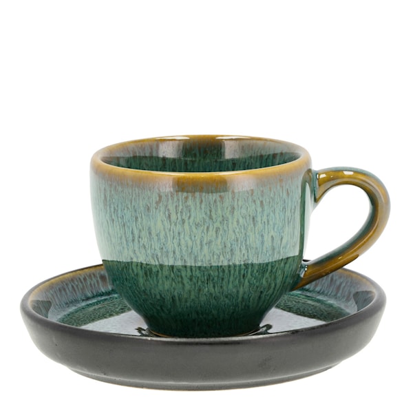 Espressokopp med Fat 7 cl från Bitz är en klassisk espressokopp med handtag och matchande fat i robust stengods. Koppen har en härligt musigt färgsättning i blank glasyr medan undersidan av fatet har en matt, svart glasyr. Espressokoppen finns i två olika färgutföranden. Stengodset tål maskindisk, mikrovågsugn och ugn upp till 220 grader.