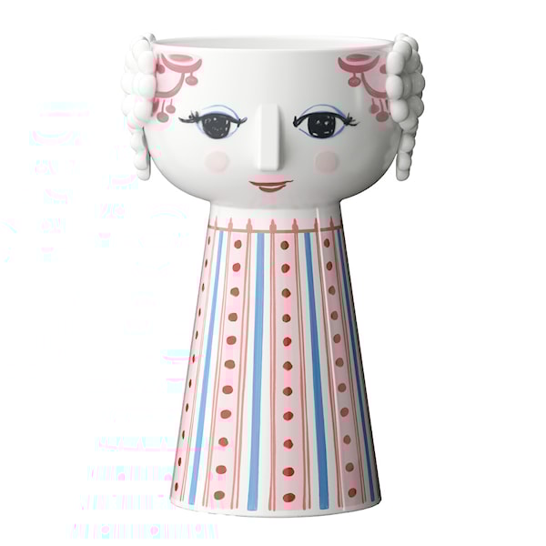 När du tänder ett ljus i Eva-ljusstaken sprider den ett varmt och inbjudande ljus som gör vardagen lite mer färgrik och glädjefull. Tillverkad av blankglaserad keramik och dekorerad med en färgad dekal, är denna ljusstake inspirerad av Wiinblads ursprungliga Eva-figurer. De kännetecknas av breda huvuden med blommönster och en konformad kropp. Ansiktet med mandelformade ögon och spetsig näsa är troget Wiinblads ursprungliga design, medan de livfulla mönstren på klänningen är en modern tolkning av hans klassiska illustrationer.
